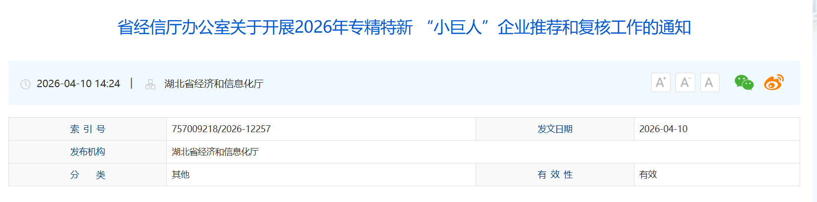省经信厅办公室关于开展2026年专精特新 “小巨人”企业推荐和复核工作的通知